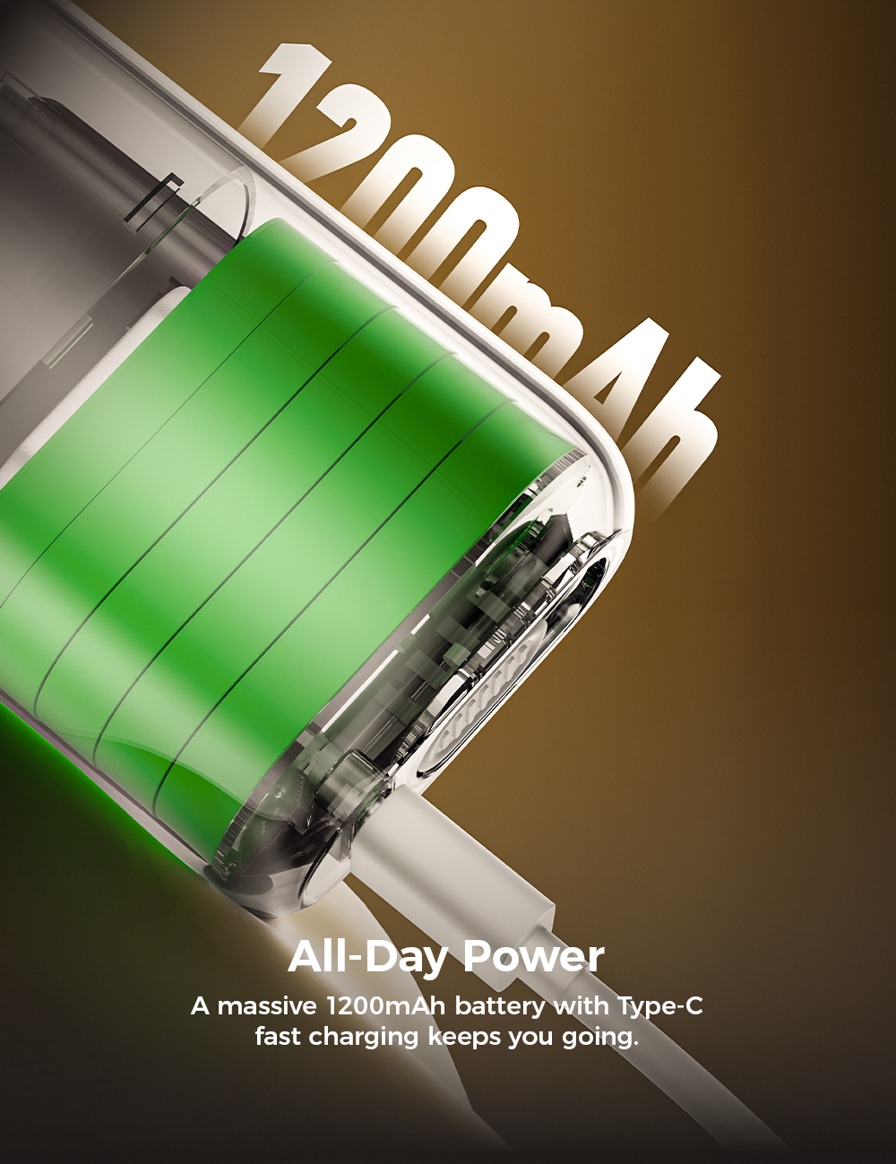 1200 mAhkapacitású újratölthetƑ akkumulátor biztosítja a konszisztens teljesítményt reggeltƑl estig. Type-C gyorstöltéssel pillanatok alatt visszakerülsz teljes teljesítményre.